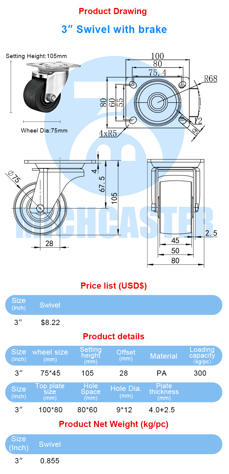 Low center of gravity stainless steel nylon caster(Wheel width 45mm)