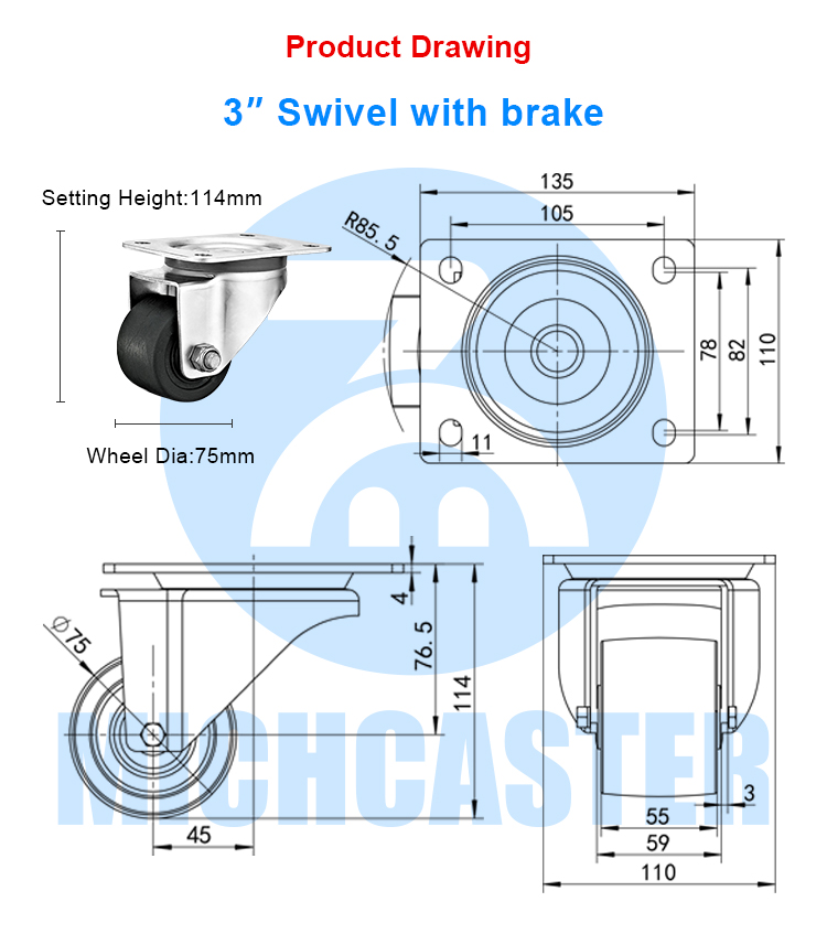 Low center of gravity stainless steel nylon caster(Wheel width 55mm)