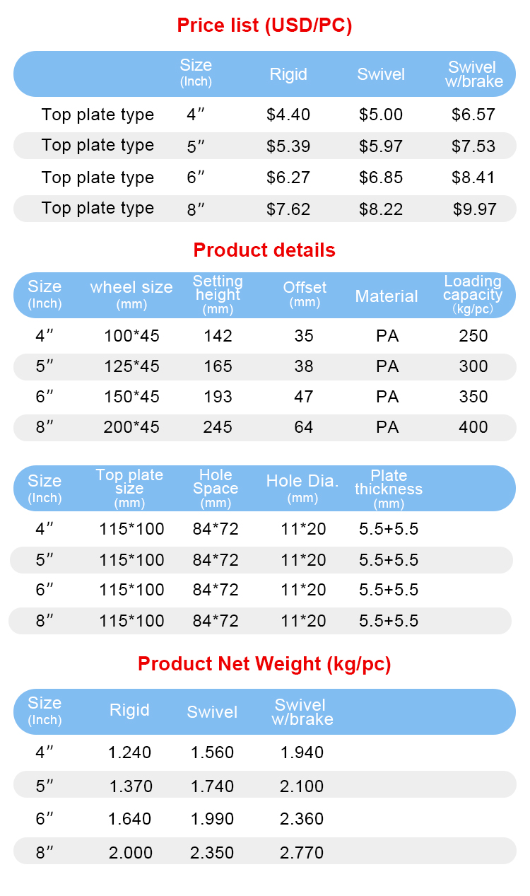 It just shows standard casters in on-line MICHCASTER shop, other wide variety of casters are available in MICHCASTER factory, if you do not find information you need, please contact us directly.
