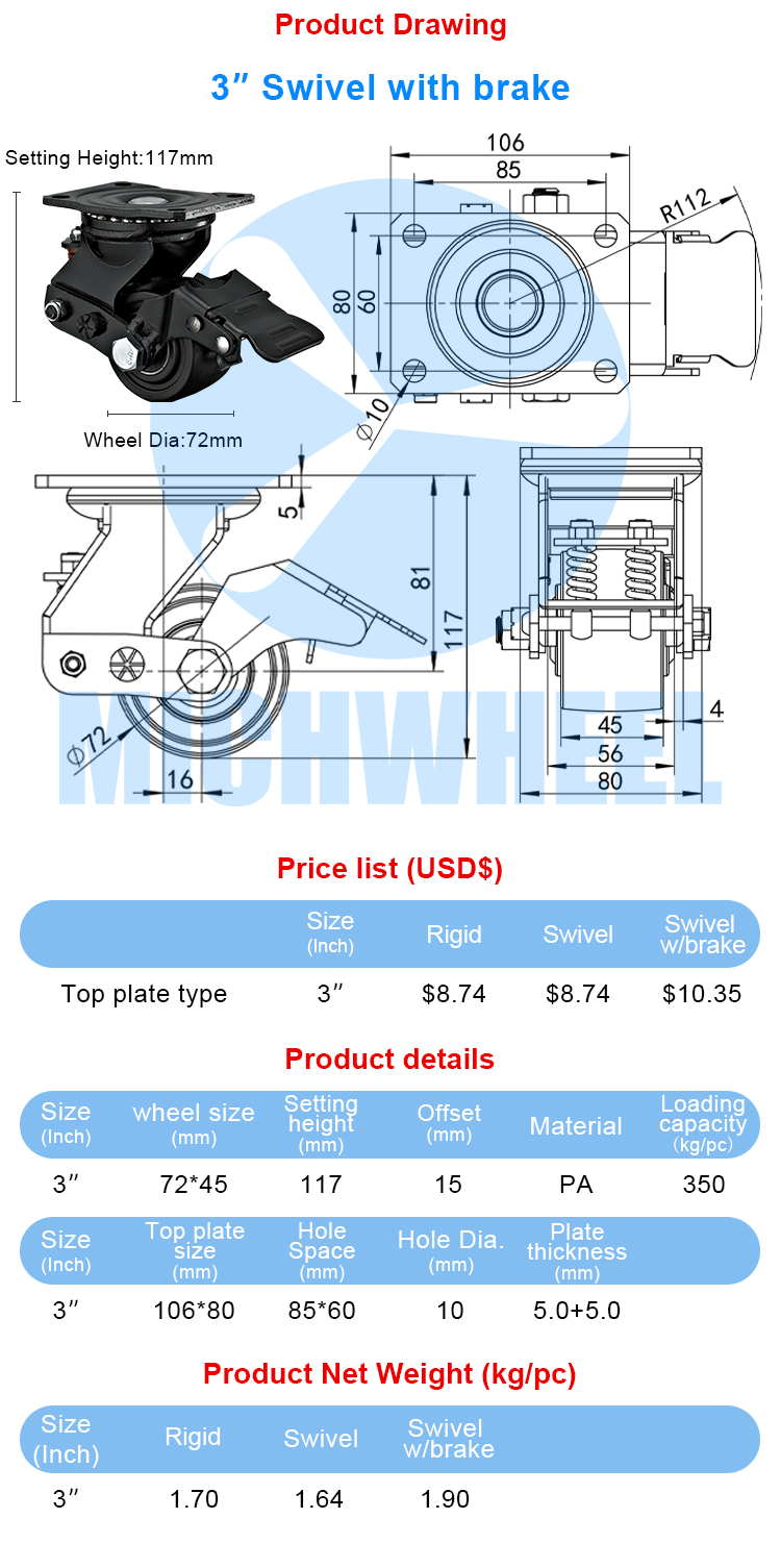 Zinc-plated pressed steel housing with double steel ball raceway in swivel head